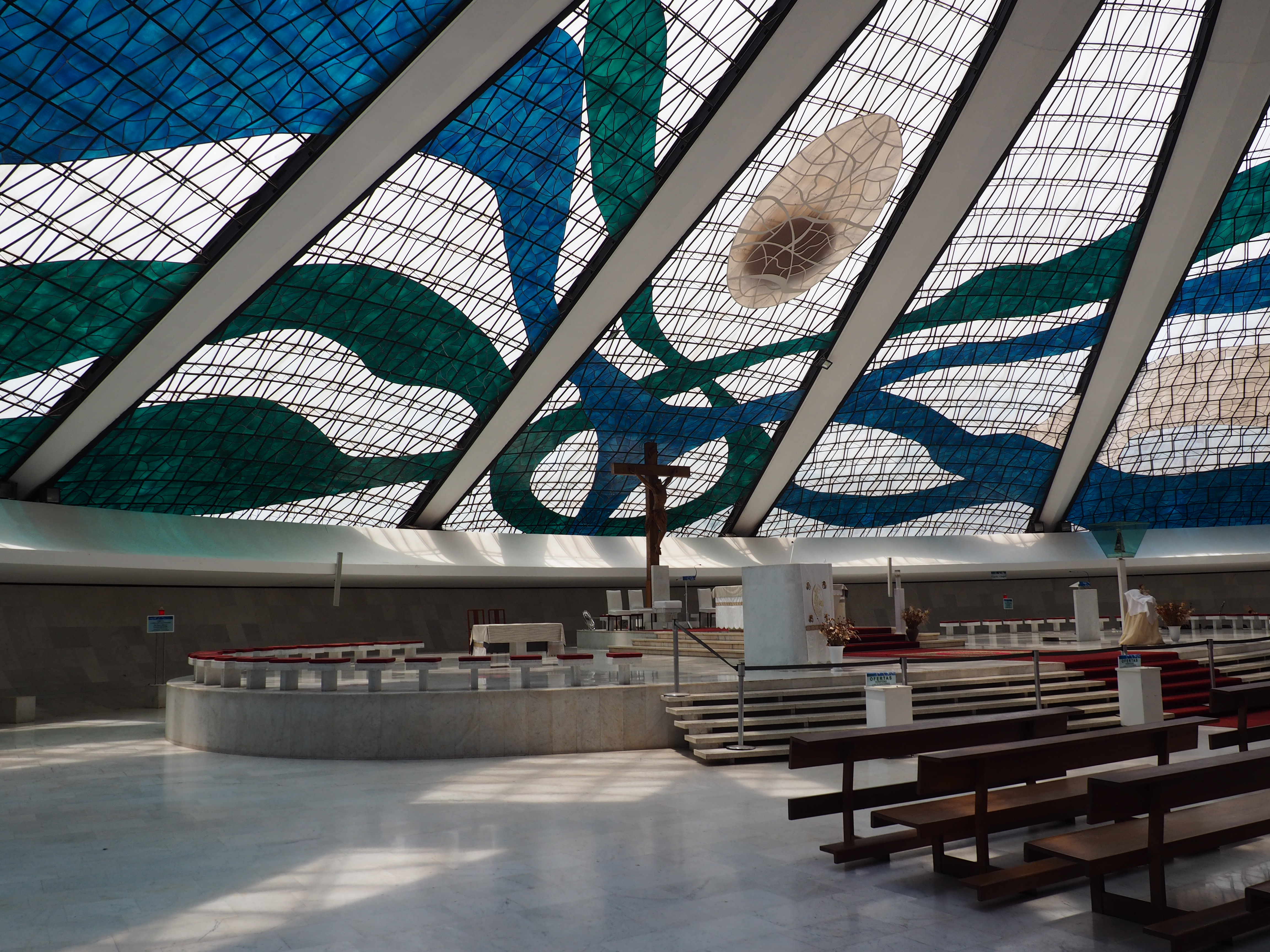 La cathédrale est semi-enterrée. Depuis le parvis, on y pénètre en suivant une longue rampe – quand on se fait déposer en voiture, on emprunte un second passage depuis dépose minute-souterrain. Au fur-et-à-mesure qu’on avance dans le tunnel, le silence et la pénombre nous préparent à changer d’atmosphère et à entrer sous la lumière.